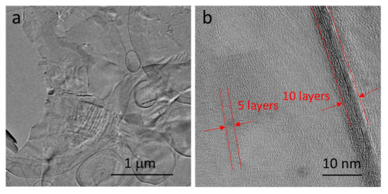 High-resolution transmission electron microscope (HRTEM) images of the graphene film on the surface of Ni–P–G: (a) enlarged view; (b) edges of the graphene film.
