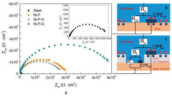 Nyquist plots of the Q235 steel, Ni–P, Ni–P–H, and Ni–P–G at the immersion time of 2 h in 3.5 wt % NaCl solution (a) and the equivalent circuits for the Q235 steel (b) and the three type of coatings (c).
