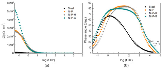 Bode plots of the Q235 steel, Ni–P, Ni–P–H, and Ni–P–G at the immersion time of 2 h in 3.5 wt % NaCl solution: (a) frequency-impedance magnitude curves; (b) frequency-phase angle curves.