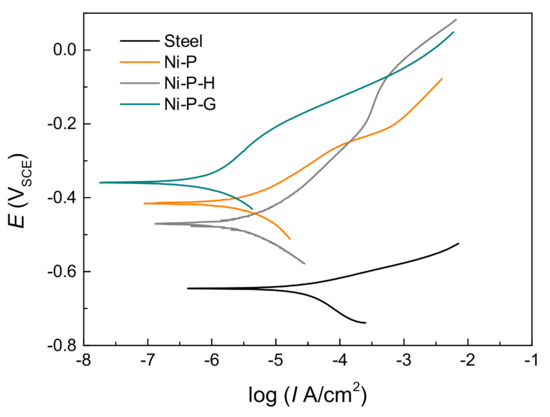 Potentiodynamic polarization curves of the Q235 steel, Ni–P, Ni–P–H, and Ni–P–G in 3.5 wt % NaCl solution.