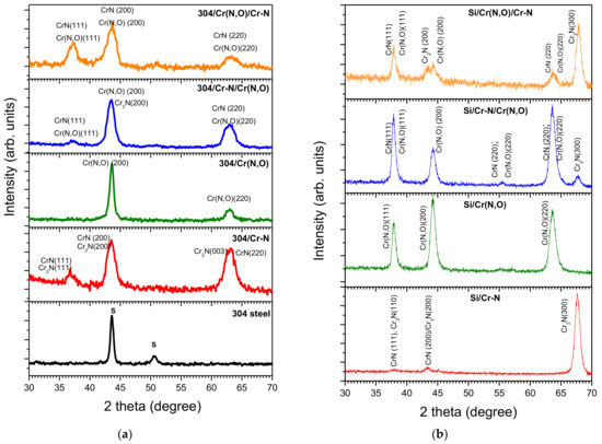 Due to the significant overlapping of 304 SS peaks and those of the deposited coatings (Figure 2a), Figure 2b shows the XRD patterns of the coatings deposited on silicon wafers, discussed as follows. The diffractogram of the Si/Cr–N monolayer presents a shallow peak at 37.7° corresponding to (111) cubic CrN phase (JCPDS 11-0065, at 37.57°) or to the hexagonal (110) Cr2N phase (JCPDS 35-0803, at 37.35°). Additionally, a second small peak situated at 43.38° was attributed more probably to the (200) plane of hexagonal Cr2N phase (JCPDS 35-0803, at 43.40°) than to (200) plane in B1 phase (JCPDS 11-0065, at 43.77°). The high-intensity peak observed at 67.6° was ascribed to the hexagonal Cr2N phase (JCPDS 35-0803, at 67.3°), suggesting that the deposition conditions favour the formation of a highly-stressed Cr2N coating. Our results are in good agreement with those reported by Rebholz et al., who showed that in chromium nitride with nitrogen content of about 30 at.%, only Cr2N phase is present [64], similar to our result (30.5 at.% N). They also showed that both Cr2N and CrN phases coexist in coatings if the nitrogen content is raised to about 40 at.% [64]. This result is also consistent with the phase diagram of the Cr–N system [65]. Considering the XRD pattern of the coating deposited on SS, one can observe a first broad peak, most probably representing the superposition of the (111) cubic CrN phase and (110) hexagonal Cr2N phase. The second peak is also broad, higher than the one observed on Si substrate. As such, the presence of (200) planes of the hexagonal Cr2N and cubic CrN phases is evident from the peak asymmetry. A distinctive feature of the coatings grown on SS is the presence of a third broad peak at about 63°, indicating the overlap of the (211) plane of Cr2N (JCPDS 35-0803, at 62.44°) and the (220) plane of CrN (JCPDS 11-0065, at 63.60°). Note also that the (300) Cr2N maximum observed on the Si deposited coating is no longer visible.