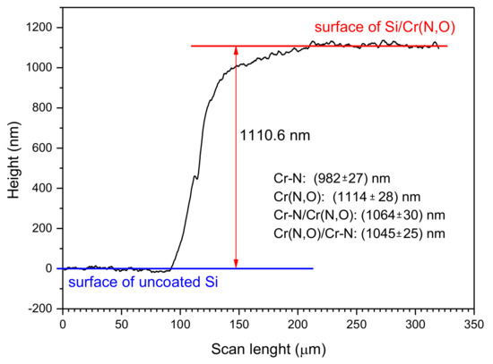 Figure 3 presents, as an example, a profile line of the edge measured on Cr(N,O) coating deposited on the masked Si piece. Additionally, the thickness values of all the investigated coatings are shown.