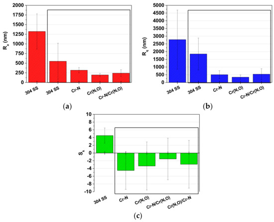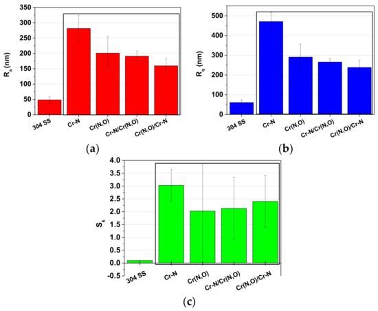 The roughness of Cr-based coatings after the corrosion test: (a) Ra parameter; (b) Rq parameter; (c) Sk parameter.