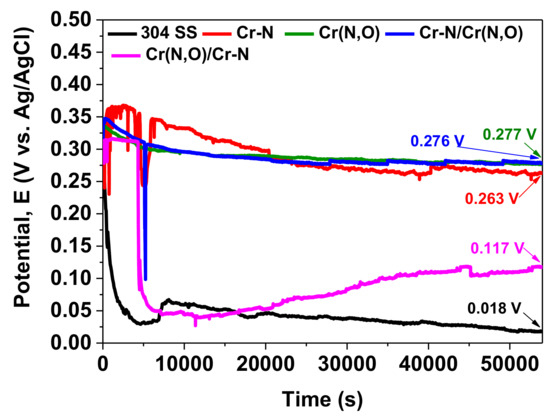 Open circuit potential evolution of Cr-based coatings deposited on 304 SS.