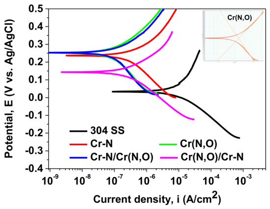 Tafel plots of Cr-based coatings deposited on 304 SS steel; the inset presents the fitting lines in the Tafel plot of Cr(N,O) coating.