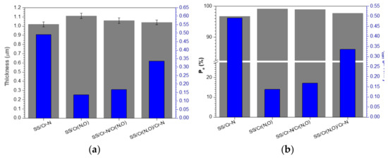 Figure 9a presents the evolution of corrosion current density (icorr) versus the coatings’ thickness. One may observe that the increase of coating thickness was accompanied, as expected, by the decrease of icorr and the increase of the protection efficiency, as shown in Figure 9b. The comparison of Cr–N and Cr(N,O)/Cr–N coatings provides evidence that the superior corrosion resistance of the bilayer might be related to its higher adhesion to the substrate and with the presence at the substrate interface of the Cr oxynitride layer, conferring a higher protection efficiency to the bilayer. For the Cr–N/Cr(N,O) bilayer, a small decrease of the protection efficiency and icorr values compared to Cr(N,O) monolayer was evident, despite the modest adhesion performance of the monolayer on SS. Probably the superior corrosion resistance of the Cr(N,O) monolayer might be related to the low roughness, low porosity, and low quantity of microdroplets.