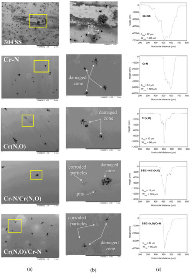 According to the electrochemical parameters, the following evolution of corrosion resistance can be stated: Cr(N,O) > Cr–N/Cr(N,O) > Cr(N,O)/Cr–N > Cr–N > SS. By comparing the profilometry lines on selected pits (Figure 11c), it can be seen that the pits found on uncoated 304 SS substrate were deeper and larger than those found on coated surfaces. The Cr(N,O) coating exhibited the best corrosion behaviour, which also showed the small dimensions of pits that appeared during the corrosion tests. This result supports the electrochemical results.