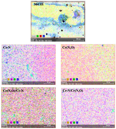 Energy dispersive X-ray spectrometry (EDS) mapping micrographs of the Cr-based coatings after the corrosion test.