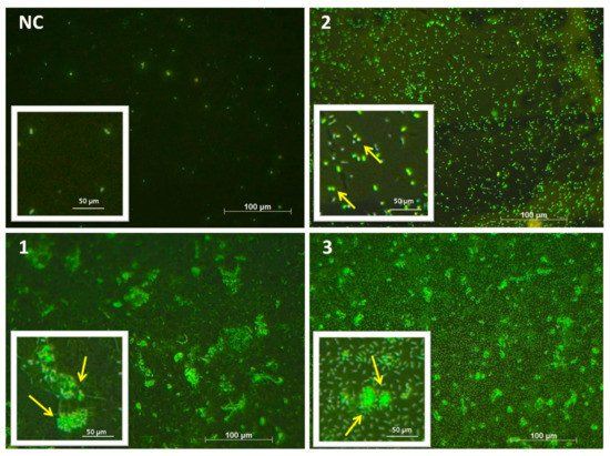 Fluorescent microscopy pictures of SYTO 9 stained C. marina biofilms formed after 1 h incubation on (NC) negative control, glass slide with staining procedure and without bacteria; and on glass samples with PEG-silane co-cross-linked coatings containing: (1) 6.0 wt % conventional cross-linker, ES 40 (control, bacteria and staining); (2) 4.0 wt % ES40 + 2.0 wt % PEG-silane; (bacteria and staining); (3) 6.0 wt % ES40 + 2.0 wt % PEG-silane, (bacteria and staining). The yellow arrows indicate areas with stained bacteria.