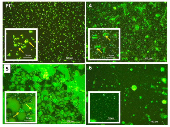 Fluorescent microscopy pictures of SYTO 9 stained C. marina biofilms formed after a 1 h incubation on (PC) positive control, glass slide with staining procedure and bacteria and on glass samples with PEG-silane co-cross-linked coatings containing modifying agent: (4) 4.0 wt % ES40 + 2.0 wt % PEG-silane + 0.5 wt % NIS; (bacteria and staining); (5) 4.0 wt % ES40 + 2.0 wt % PEG-silane + 2.0 wt % AO; (bacteria and staining); (6) 4.0 wt % ES40 + 2.0 wt % PEG-silane + 0.5 wt % NIS + 1.5 wt % AO, (bacteria and staining). The yellow arrows indicate areas with stained bacteria.