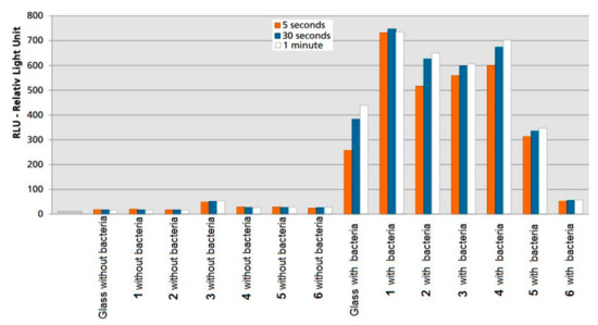 The bacterial biofilm on the tested coatings, formed after 1 h incubation in 4 × 107 cfu/mL C. marina strain, was quantitatively estimated by ATP bioluminescence , since the intensity of the emitted light is directly proportional in the enzyme linked assay to the ATP quantity and, respectively, to the amount of bacterial cells. In Figure 4, the relative amounts of fluorescent light are presented, which are produced by the bacterial films for 5 s, 30 s, and 60 s after the addition of the reagents. It is observed that the glass surface (Figure 4, glass with bacteria) is in the middle regarding C. marina growth, whereas on the control siloxane coating, conventionally cross-linked with ES40 (Figure 4, coating 1), the bacterial growth is at the maximum and about twice as high. Coatings 2 and 3 are also hydrophobic, with WCA similar to that of sample 1 (Table 1). Generally, C. marina growth is relatively high on these three hydrophobic surfaces, which is in agreement with some reports on favorable bacterial adhesion on hydrophobic surfaces [24,25].