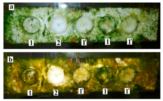 Microbial growth after four (a) and six (b) months of exposure in a Black Sea aquarium on vulcanized siloxane coatings, cross-linked with: (1) 6 wt % conventional cross-linker, ES40 (control); (2) 6 wt % PEG-silane instead of 6 wt % ES40; (1’) 4 wt % ES40 + 2 wt % PEG-silane.
