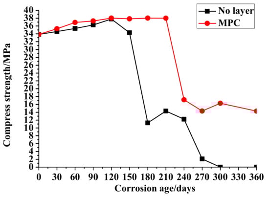 The change of the compressive strengths of the no-layer and MPC-layer concrete cubes by age are shown in Figure 1. The average compressive strength of the no-layer concrete cubes was 20.18 Mpa, and the deviation of compressive strength was 15.44 Mpa. Therefore, the coefficient of variation was 76%. When the corrosion time increased from 0 to 150 days, there was a steady increase of the compressive strength of the no-layer concentrate accordingly. At 180 days, sulfate corrosion damaged the concrete structure surface, leading to the sharp decrease of the compressive strength. In addition, the compressive strength fluctuated from 10 to 15 MPa in the interval from 180 to 240 days. When corrosion continued for 270 days, the damage caused by sulfate erosion eventually caused the collapse of the concrete structures and the sudden decrease of strength until zero.