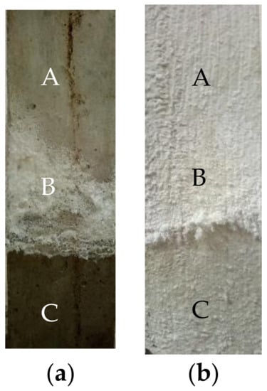Morphology of concrete specimens immersed for 210 days: (a) No layer; (b) MPC. (A: Atmospheric region zone; B: Crystal precipitation zone; C: Immersion zone).