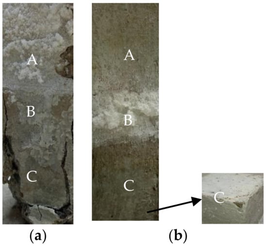 Morphology of concrete specimens immersed for 360 days: (a) No layer; (b) MPC. (A: Atmospheric region zone; B: Crystal precipitation zone; C: Immersion zone).