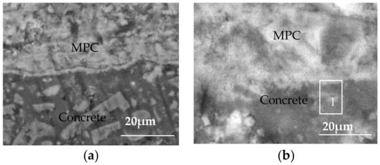 The morphology, observed via SEM, of the interface between the MPC layer and the concrete substrate is shown in Figure 5. During the initial contact between the concrete specimens and the sulfate solution, corrosive ions entered the internal concrete structures under the synergistic effect of capillary adsorption and water evaporation. Figure 5a shows that the MPC layer was tightly associated with the concrete substrate in the early corrosion period, thus forming a dense and uniform protective layer that separated the concrete structure from the external environment, and the filling up of pores in the concrete structure. This protective layer relieved the wicking effect and prevented the formation of high-concentration pore solution areas in the concrete structure, and consequently significantly kept sulfate ions out of the concrete structures. This layer can protect concrete structures from sulfate corrosion when it is integrated.
