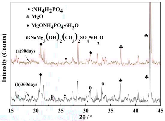 XRD of the MPC protection layer in the early and late corrosion stages: (a) 90 days; (b) 360 days.