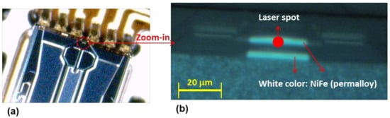 As shown in Figure 1, a customized micro-Raman spectroscopy instrument with the back scattering configuration was used to measure the critical temperature to initiate the thermal degradation of DLC films. The laser source had the wavelength of 514.5 nm and its focused beam on the sample surface had a diameter of 10 μm. A holographic notch filter was applied to get rid of the Rayleigh scattering line. An 1800 line/mm grating was used to disperse the reflected laser light onto a linear CCD camera that has 1204 pixels for collecting the spectrum. The spectral resolution of the system was 2.0 cm−1 and the precision was 0.2 cm−1 [16]. Figure 2 shows the optical microscope image of the tested head slider sample. The laser source was applied to the read/write sensor area, i.e., red-circle zone in Figure 2a, where the transparent DLC film was deposited over the underlying permalloy substrate, i.e., the white stripe area in Figure 2b.