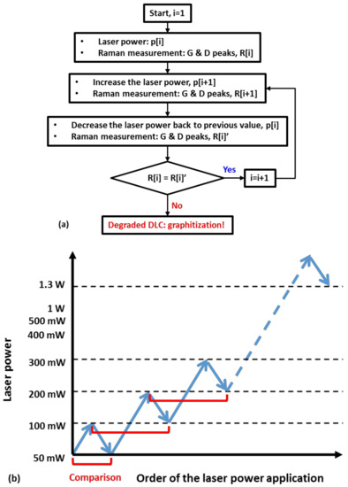 New Raman spectroscopy technique to determine the thermal degradation of DLC film: (a) Flow chart to Raman experiment; (b) the laser power setting used in this experiment.