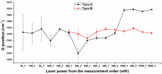 Figure 5 shows the measured G peak position values with respect to the laser power, where the black-square and red-circle symbols are the type-A and type-B DLC film, respectively, and the error bars represent one standard derivation of the peak fitting results determined by PeakFit® software. The bigger standard deviation at lower laser power would be attributed to the weaker Raman spectra signal. The type-A DLC film sample produced reasonable Raman spectra at the laser power from 50 mW to 1.3 W, whereas the Raman spectra signal for the type-B DLC film sample was pretty weak at low laser power condition. For this reason, the Raman parameters of the type-B DLC film could be measured at laser power greater than 200 mW. It is noted that the x-axis in Figure 5 is the applied laser power of Raman measurement following the methodology described in Figure 3, which enables one to check the thermal degradation of DLC film at the specified laser power. Examining the measured G peak position values in Figure 5, first, it was observed that the initial G peak position was ~1552 cm−1 for both types of DLC films, which is in agreement with the reported Raman data for similar DLC samples [19]. Next, for the case of the type-A DLC film, its G peak position did not show significant change until the laser power reached 500 mW. However, when the laser power increased to 1 W, the G peak position significantly jumped from 1547.1 to 1568.9 cm−1. This indicates that the sp2 bonding fraction in the type-A DLC film steeply increased at the laser power of 1 W leading to the conclusion that the type-A DLC film developed significant graphitization process or thermal degradation. After then, even at the higher laser power, the G peak position did not return to the previous point but permanently changed to the high value close to 1568.9 cm−1. From these trends of G peak position values, it could be found that the critical laser power to initiate the thermal degradation on the type-A DLC film would be in between 0.5 and 1 W. At the highest laser power of 1.3 mW, the type-A DLC film still showed the degraded condition, whose G peak position remained almost the same as the value at 1 W. Lastly, for the case of type-B DLC film, it was observed that its G peak position value stayed at the constant value of ~1551.8 cm−1 at all laser powers, which indicates that the type-B DLC film did not undergo any significant change in bond structure and accordingly showed reasonable thermal stability under the tested laser power range [17].