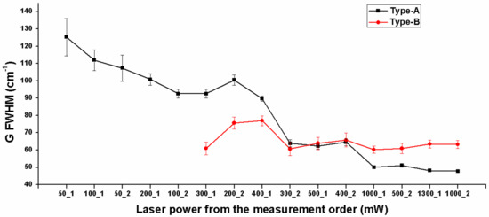The measured G peak width (FWHM) for the two types of DLC film with respect to laser power, where the x-axis the input laser power in the order of measurement. Note that on the x-axis, the first number is the input laser power and the second number is the order of measurement (e.g., ‘50_2’ means the 2nd measurement at the laser power of 50 mW).