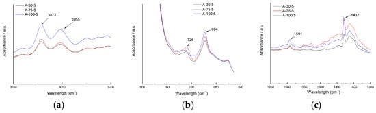 Fourier transform infrared (FTIR) spectra of the phenyl group in coating samples: (a) the stretching vibration peaks of =C–H in the phenyl group at 3072 and 3055 cm−1; (b) the out-of-plane bending vibration peaks of =C–H in the phenyl group at 725 and 694 cm−1; (c) the stretching vibration peaks of C=C in the phenyl group at 1591 and 1488 cm−1.