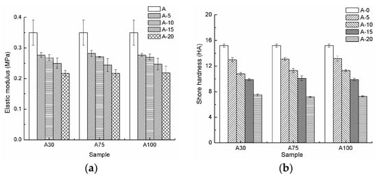The mechanical properties of coating samples: (a) elastic modulus; (b) shore hardness.