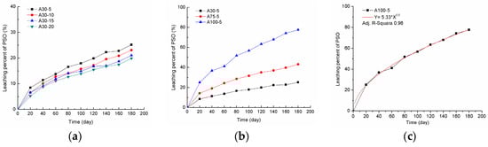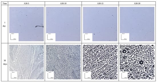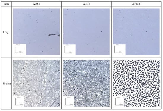 Samples with dimensions of 150 mm × 150 mm × 2 mm were used to observe the leaching of the PSO. The morphology of the sample is shown in Figure 4 and Figure 5 with 1 day and 30 days of exposure. After 1 day of exposure, no PSO was leached on the coating surface. With the extension of exposure time, PSO was gradually leached. It was also shown that the coating incorporating high viscosity and high additive amount of the PSO leached more PSO in the same amount of time. The leaching percent–time curve is shown in Figure 6. It basically follows the Higuchi diffusion equation (Figure 6c). By fitting the curve, the time needed for the complete leaching of the PSO could be simulated (Table 4). Although the increase of the PSO content resulted in the increase in the leaching amount of the PSO from the coatings at the same elapsed time, it also showed that the leaching percent of the PSO decreased with increasing PSO content. Coatings with low-viscosity PSO had a longer release time. For the coating A30-20, the time required for the complete leaching of the PSO exceeded 5890 days. In contrast, the coating of A100-5 released all the PSO in only 350 days.