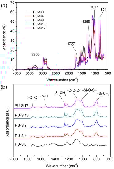 Fourier transform infrared (FTIR) spectra of the PU-Sis samples: (a) wave number from 4000 to 600, (b) wave number from 2000 to 600 local amplification of (a).