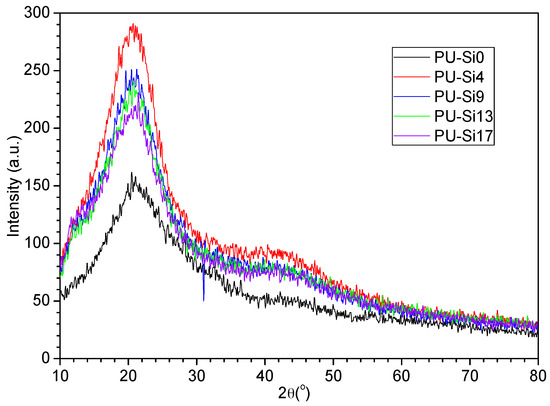 Peaks at 3300 cm−1 (hydrogen-bound N−H), 1727 cm−1 (free urethane carbonyl), 1705 cm−1 (hydrogen-bound carbonyl) and 1600 cm−1 (benzene) weakened obviously with the addition of PDMS. The intensities of siloxane group peaks at 1259 cm−1 (Si−CH3 bending), 1017 cm−1 (Si−O−Si stretching), and 801 cm−1 (Si−CH3 rocking) increased with increasing PDMS content. This indicated that more and more PDMS present in PU-Sis samples with increasing PDMS content. XRD is a bulk characterization technique that can provide direct evidence for crystalline or amorphous in segmented and block copolymers, and was used to investigate the microstructures of the PU-Sis films. The XRD patterns of the samples (Figure 2) were similar, with intense and weak broad diffractions at 2θ = 20° and 42°, respectively. The former shows that there is micro crystalline domain in the hard segment of polyurethanes. The latter is typical of amorphous polymers. In addition, weaker peak observed at 2θ = 12° appears only in the samples containing PDMS. With the increase of the content of the PDMS, the intensity of the peaks decrease, the order degree in the polyurethanes decrease. Adding PDMS resulted in the characteristic diffraction peak at 21.28° shifting to 20.63°, because of the narrower molecular width of PDMS compared with pure polyurethane [27].