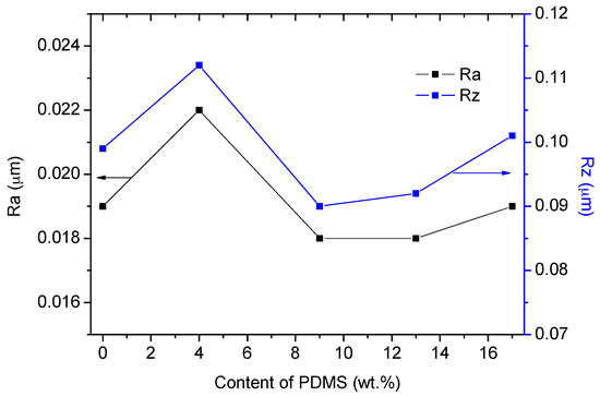 Figure 5 shows trends in surface roughness of the PU-Sis samples, as determined in the field of 128 μm × 128 μm by CLSM. This trend could be explained by phase separation, and the tendency of PDMS to enrich on the copolymer surface. Introducing PDMS in PU increased the phase separation, so the surface of PU-Si4 was rougher than that of PU-Si0. Increasing the PDMS ratio also enriched the PDMS content on the copolymer surface, which led to the lower surface roughness observed for PU-Si9. This enrichment in PDMS had reached saturation in PU-Si9. Phase separation continued to increase with increasing PDMS content, which increased the roughness from PU-Si9 to PU-Si13 and then to PU-Si17.