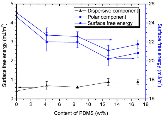 Figure 8 shows the surface free energies and their corresponding polar and dispersive components of the PU-Sis samples. The surface free energies and components were calculated from contact angle measurements according to the Owens two-liquid method [25]. The test liquids were deionized water and diiodomethane. The total surface free energies of PU-Si4, PU-Si9, PU-Si13 and PU-Si17 were approximately 5 mJ/m2 lower than that of PU-Si0. PU-Si0 had the highest polar component and lowest dispersive component of the surface free energy. Samples containing PDMS exhibited similar dispersive components.