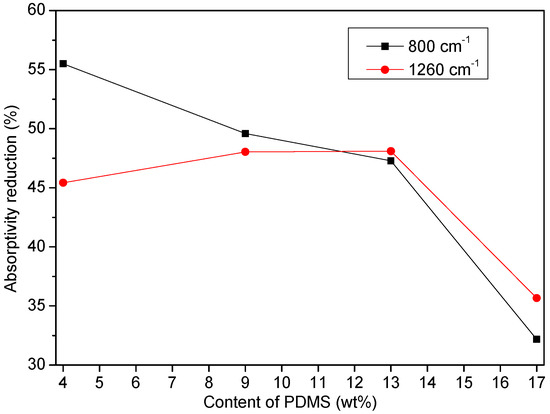 Figure 11 shows the absorption reduction at 801 and 1259 cm−1 of samples containing PDMS after immersion. The absorptivity reduction at 801 cm−1 decreased with increasing PDMS content. This indicated that the water resistance of PU-Sis increased with increasing PDMS content.