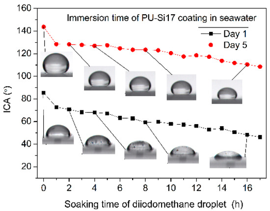 As mentioned earlier, the chemical properties of the coating surface change upon immersion in seawater as the surface molecules of the coating rearrange and the polar hard segments move to the surface of the coating. Hence, to better evaluate the interface behavior of the polyurethane coatings during seawater immersion, diiodomethane was selected for in-situ measuring ICA. Due to that diiodomethane has significant solubility in water (1.2 g/L). With increasing time immersed in seawater of diiodomethane droplet, we are afraid that in case of the diiodomethane dissolved in water, it might lead to smaller measurements. To evaluate its effect, we carried out a long time in-situ observation of diiodomethane droplets on the interface between seawater and coating. The results of PU-Si17 coating respectively immersed one day and five days were showed in Figure 15. With increasing of immersion time, both of the droplet and ICA changed smaller. However, as showed in Figure 16, in which Figure 16a,b for coating immersed one day in sterilized seawater, Figure 16c,d for coating immersed five days. Figure 16a,c for dripped diiodomethane droplet in 10 s, and Figure 16b,d at 60 s. Quite evidently, the dissolution of diiodomethane was not obvious at the early stage of immersion in seawater, and the change of shape of droplets and interface contact angle were not obvious. In order to ensure the validity and comparability of the measurement results during the experiment, the images were frozen after dripped in ten seconds. Based on these images, the measured results of ICA of all samples were reported in Figure 17.