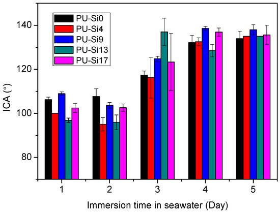 The ICA increases with increasing immersion time, the ICA tends to be stable after four days immersion. It increases from around 100° at early immersion to 135° after five days immersion. Similarly phenomenon used to observe for the PPG-TDI-BDO polyurethane coatings in previous research [24]. When immersed in seawater, polyurethane coatings will exhibit different physicochemical properties from those exposed in air. Because polar hard segments tended to migrate toward the coating surface during immersion, it tends to form a hydrophilic and oleophobic surface. The enhanced oleophobicity further inhibited the adhesion of marine organisms. The increase in the contact angle may also have some contribution from an increase in surface roughness caused by the collapse of surface PDMS chains underwater.