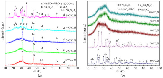 XRD patterns of the MWG binder under different temperatures with different times are given in Figure 2. The presence of Na2SiO3·9H2O, Na2Si3O7, HCOONa, and SiO2 are revealed from 100 °C to 300 °C, together with amorphous phase at 25° to 35°. The presence of an amorphous phase can be attributed to the random arrangement of the water glass. The β–Na2Si2O5 with poor crystallinity is observed at 400 °C. From 500 °C to 600 °C, The β–Na2Si2O5 is crystallized well. When the temperature increases to 700 °C, the phase changes into αIII–Na2Si2O5. Depending on the different temperatures and pressures, there are eight kinds of crystal forms [18]. The structures for all kinds of Na2Si2O5 are lamellar. A six-membered ring is formed by a layer of [SiO4] tetrahedron, and Na+ combines with a non-bridge oxygen of the [SiO4] tetrahedron. Free Na+ can combine with the [SiO4] tetrahedron to form a remote-ordered crystal structure at 400–700 °C. Sodium water glass returns to an amorphous state when the temperature increases to 800 °C. The melting point (Tm) of sodium water glass is 1100 °C, and the phase transition point (Tg) is 805 °C. Tm/Tg > 2/3, showing that the sodium water glass easily obtains an amorphous structure.