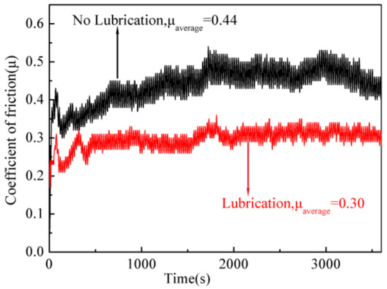 Figure 7 shows the coefficient of friction (μ) as a function of the sliding time under unlubricated and lubricated conditions. The lubricant is the glass coating mixed with WMG binder. When the lubricant presents, the coefficient of friction stabilizes quickly at 0.30. It is noted that the coefficient of friction substantially reduced by up to 30% compared with unlubricated condition, which is due to the presence of a viscoelastic film of the molten MWG at the boundary lubricant regime [20].