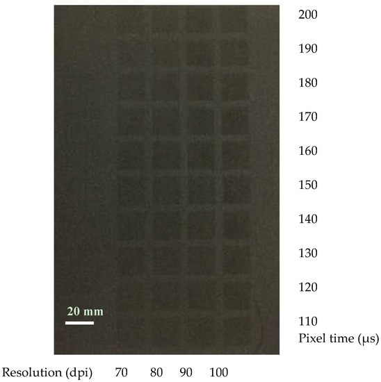 Figure 1 shows the image of carbon fibre fabric laser-engraved with different combinations of laser process parameters, i.e., pixel time (110, 120, 130, 140, 150, 160, 170, 180, 190 and 200 µs) and resolution (70, 80, 90 and 100 dpi). Obviously, the laser treatment can introduce pattern and design effect on the carbon fibre fabric. Since carbon fibre fabric is very difficult to be coloured, the pattern and design effect can enhance aesthetic properties of the fabric. With the use of laser processing, there is no significant change in electrical resistance of the laser-treated carbon fibre fabric. Thus, laser treatment is a good process to enhance aesthetic properties of carbon fibre fabric without altering its original electrical properties [21,22,23]. Based on the pattern in Figure 1, it is noted that the pattern intensity becomes darker with increasing pixel time and resolution. The pattern with the highest darkness intensity is 200 µs/100 dpi which may be due to the highest laser energy applied.