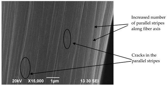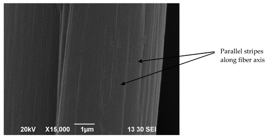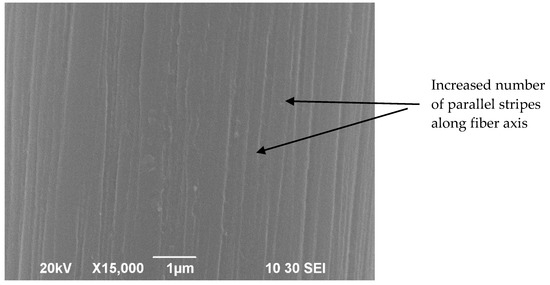 In Figure 6, it is clear that the surface modification is distributed uniformly in the carbon fibre surface as indicated at low magnification (7000×) (Figure 6a) and high magnification (15,000×) (Figure 6b).