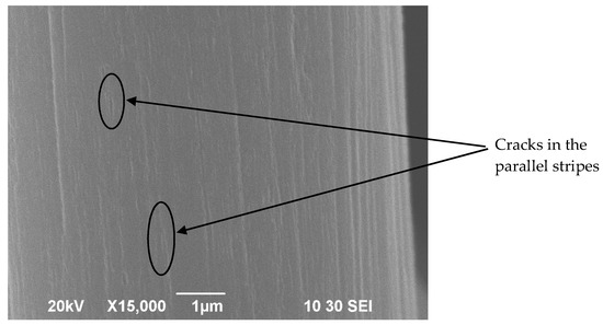 Figure 3 and Figure 5 depict specimens treated with the same resolution of 70 dpi but with different pixel times. Density of parallel stripes is similar in both but some deep cracks are noted in the case of longer pixel time (Figure 5). This is due to the long pixel time allowing more time for a laser beam to irradiate at the same location, leading to the deep crack formation.