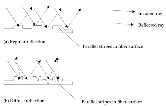 SEM image in Figure 2 shows that the surface is smooth and even in the untreated carbon fibre fabric. Parallel stripes are noted along the fibre axis with uniform size. This uniform and smooth surface structure contributes to an even surface in the untreated carbon fibre fabric. When light is reflected from such even surface, regular reflection (Figure 7a) occurs and makes the carbon fibre fabric appear lighter than other portions with laser treatment (Figure 1). On the other hand, with laser treatment, the carbon fibre surface is etched and roughened. Thus, when light is reflected from such rough and uneven surface, diffuse reflection (Figure 7b) may occur and the lustrous property of the carbon fibre fabric is reduced. Therefore, the laser-treated carbon fibre looks darker than untreated carbon fibre as shown in Figure 1.