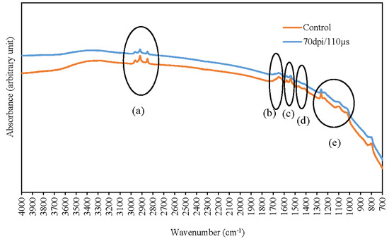 FTIR spectra of untreated and laser-treated carbon fibre fabric sample (70 dpi and 110 µs). (a) 2850–3000 cm−1; (b) 1670–1700 cm−1; (c) 1500–1600 cm−1 ; (d) 1400–1500 cm−1; (e) 1050–1250 cm−1.