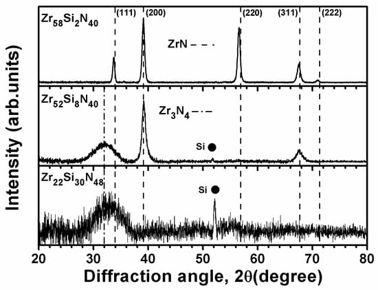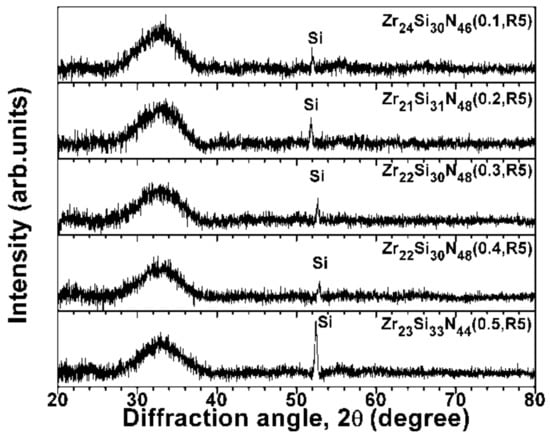 XRD patterns of as-deposited Zr–Si–N coatings prepared on Si substrates using various (N2/(N2 + Ar)) flow ratios, a substrate holder rotation speed of 5 rpm, and sputter powers of WZr = 100 W and WSi = 100 W.