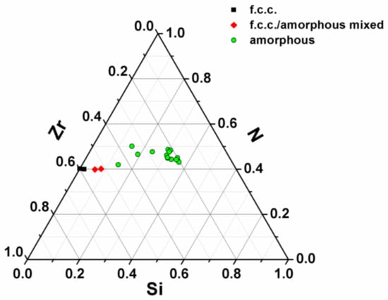 Table 1 lists the sputtering variables, chemical compositions, and thicknesses of the Zr–Si–N coatings prepared in this study. The sputtering times were controlled to deposit coatings with thicknesses ranging from 890 to 1080 nm; therefore the indentation depth of 80 nm fitted the 1/10 rule for determining the mechanical properties of the coatings. The oxygen contents in the Zr–Si–N coatings were 0.8–1.1 at.%. The samples could be designated in the form ZrxSiyN(100–x−y)(f,Rx), where f is the (N2/(N2 + Ar)) flow ratio and Rx is the substrate holder rotation speed (x rpm) in the sputtering process. Figure 1 illustrates the XRD patterns of the as-deposited Batch-II Zr–Si–N coatings prepared using sputter powers of WZr = 100 W and WSi = 100 W, a substrate holder rotation speed of 5 rpm, and various (N2/(N2 + Ar)) flow ratios ranging from 0.1 to 0.5. All the Batch II Zr–Si–N coatings with a high Si content of 30–33 at.% exhibited an X-ray amorphous phase and similar chemical compositions. The deposition rate decreased from 10.8, to 8.8, to 7.2, to 6.1, and to 5.1 nm/min as the (N2/(N2 + Ar)) flow ratio was increased from 0.1, to 0.2, to 0.3, to 0.4, and to 0.5, respectively. Moreover, the Batch III Zr–Si–N coatings prepared using sputter powers of WZr = 100 W and WSi = 100 W, a substrate holder rotation speed of 1–30 rpm, and a (N2/(N2 + Ar)) flow ratio of 0.4 also exhibited similar chemical compositions (31–37 at.% Si), a deposition rate of 5.9–6.9 nm/min, and an X-ray amorphous phase (not discussed in this paper). Figure 2 illustrates the ternary diagram of the phase distribution of all the Zr–Si–N coatings, including the Batch I coatings prepared using various sputtering powers, a substrate holder rotation speed of 5 rpm, and a (N2/(N2 + Ar)) flow ratio of 0.4, as described in our previous study []. These coatings were classified into three phase types: face-centered cubic (f.c.c.), amorphous, and f.c.c. and amorphous mixed phases.