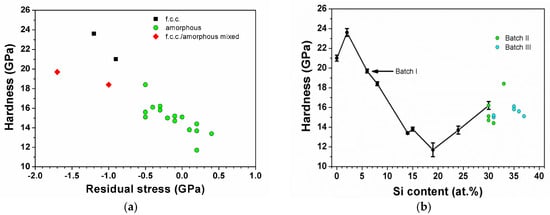 Relationships between nanoindentation hardness and (a) residual stress and (b) Si content of Zr–Si–N coatings.