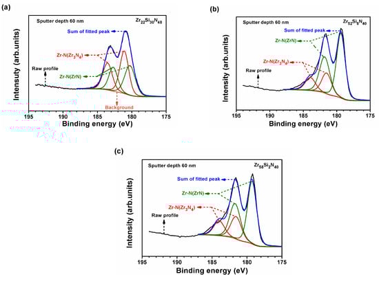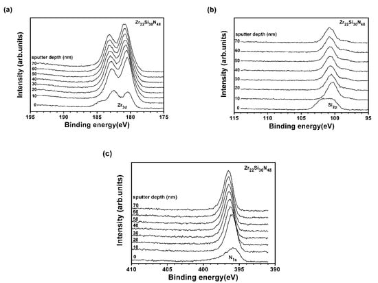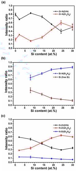 Figure 9 shows the variations in bond characteristics for various Si levels of Zr–Si–N(0.4,R5) coatings. Figure 9a,c show that Zr and N were likely to form a Zr3N4 compound as the Si content in the coatings increased, whereas Si formed Si–N bonds with increasing Si content in the coatings (Figure 9b). Thus, the bond characteristics of Zr28Si24N48(0.4,R5) and Zr22Si30N48(0.4,R5) coatings are Zr3N4- and Si3N4-dominated; therefore, the Zr–Si–N coatings with higher Si content of 24–30 at.% exhibited the hardness of Si3N4 at 18–19 GPa [,,].