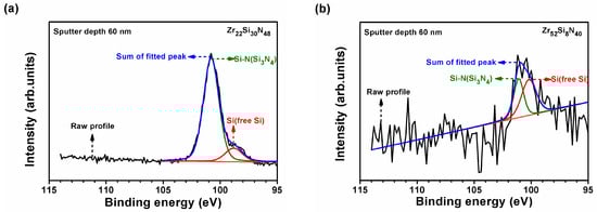 XPS profiles of Si 2p core levels of (a) Zr22Si30N48(0.4,R5) and (b) Zr52Si8N40(0.4,R5) coatings at a depth of 60 nm.