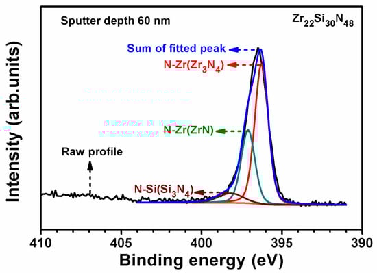 XPS profiles of N 1s core levels of Zr22Si30N48(0.4,R5) coatings at a depth of 60 nm.