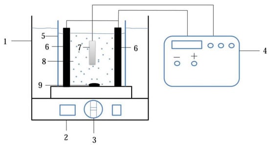 Schematic illustration of the electrodeposition setup: 1-Water bath, 2-Temperature controller, 3-RPM, 4-Power supply, 5-Container, 6-Anode, 7-Cathode, 8-Electrolyte containing TiO2 particles, 9-Magnetic stirrer.