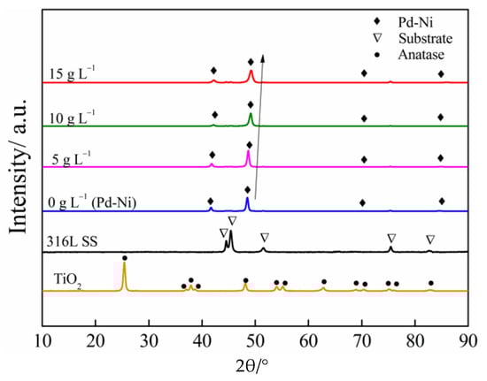 The XRD patterns of TiO2, the 316L SS substrate, and the Pd-Ni and Pd-Ni/TiO2 composite coatings are shown in Figure 2. Note that the crystalline structure of TiO2 displays a refined anatase TiO2 structure. The Pd peaks are displayed at 40.1°, 46.7°, 68.1°, and 86.6°, whereas the Ni peaks are located at 44.5°, 51.8°, 76.4°, and 92.9° [23], because metallic palladium and nickel are both face-centered cubic (FCC) crystalline phases according to Bragg’s equation. The peaks at approximately 2θ = 42.2°, 49.2°, 70.4° and 86.9° correspond to the (111), (200), (220) and (311) planes of Pd-Ni alloy, respectively (JCPDS card No: 65-5788), and each peak is between the corresponding peaks of Pd and Ni. It is indicated that all tested coatings exhibit an FCC crystalline phase according to sin2θ1:sin2θ2:sin2θ3:sin2θ4 = [(h1)2 + (k1)2 + (l1)2]:[(h2)2 + (k2)2 + (l2)2]:…:[(h4)2 + (k4)2 + (l4)2] = 3:4:8:11 (Bragg’s equation and the systematic absence law of the crystal’s X-ray diffraction) and a substitution solid solution is formed [8]. Furthermore, the (200) plane is predominant, and the diffraction peak of the (200) plane is broadened and gradually shifts to a higher angle with an increase in TiO2 particle concentrations in the electrolyte. The reason for the change of lattice will be discussed afterward. The (200) plane crystal grain size of the composite coatings that contain various concentrations of TiO2 is calculated according to Scherrer’s equation as follows [24].